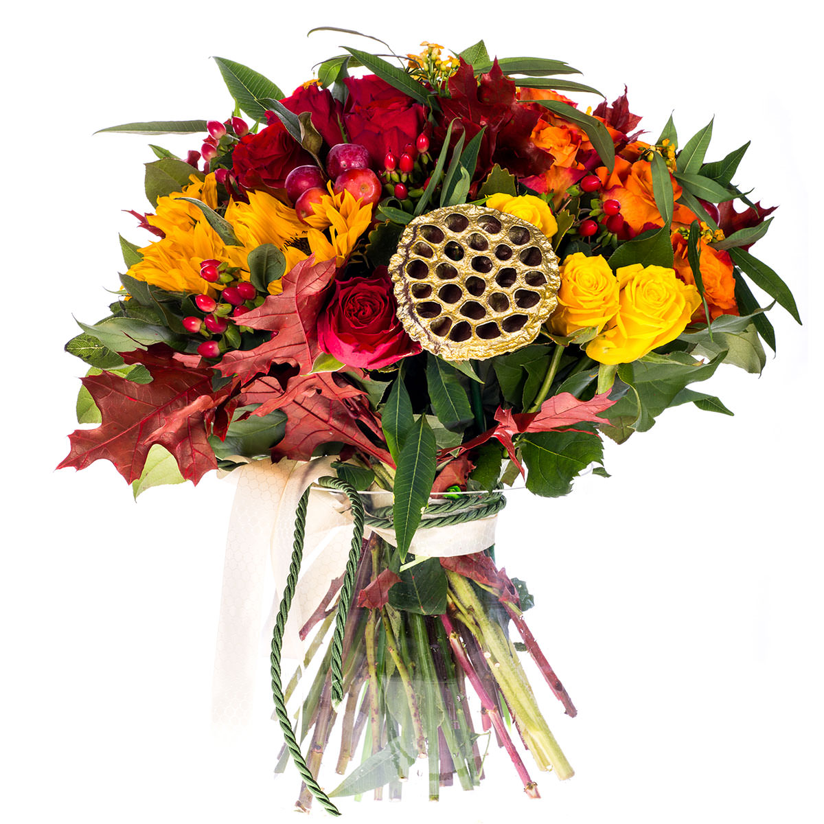 Подсолнух, роза кустовая жёлтая и оранжевая, кленовые листья, трипофобия цветок лотоса, гиперикум. Упаковка (лента, пленка, крафт, сетка, пленка матовая)